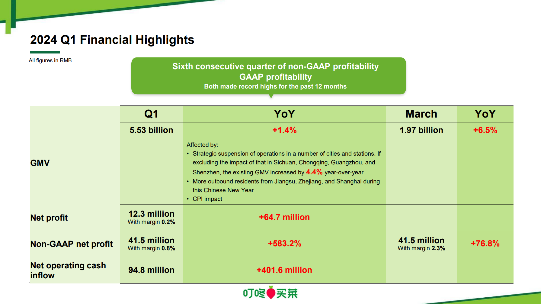 龙商网消息:5月13日晚间,叮咚买菜发布2024年第一季度的业绩报告。