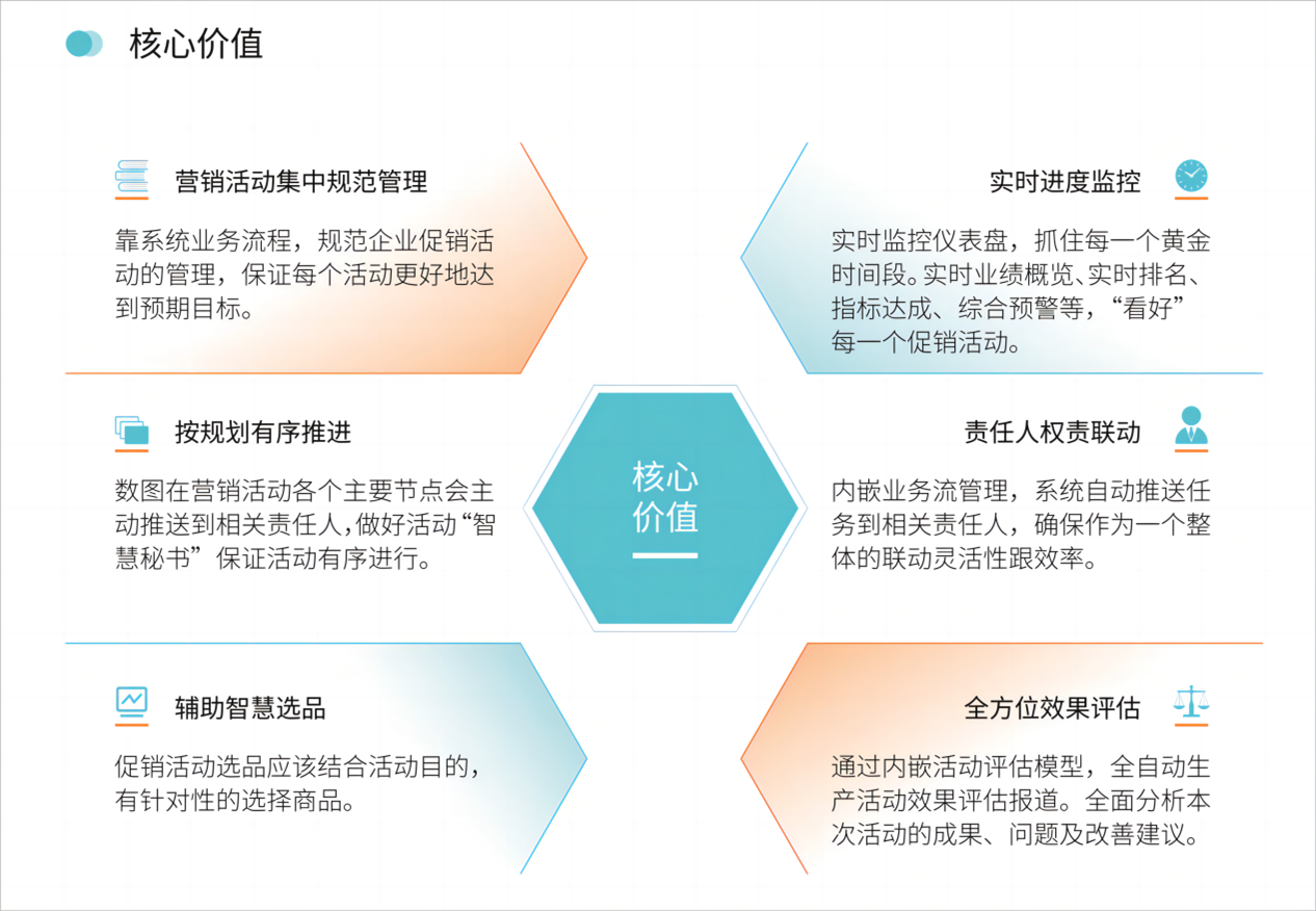 系统包括了促销活动创建、活动进度监控、辅助智能选品、活动效果评估、进行中风险监控、实时业绩仪表盘等功能。帮助企业通过系统规范商品计划、营销活动规划管理工作。