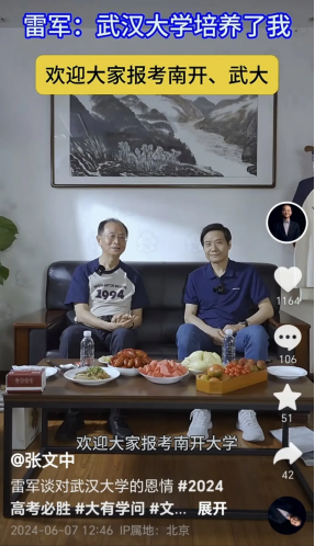 龙商网消息:6月7日,小米董事长兼CEO雷军做客 “文中的小饭桌”。恰逢高考第一天,南开校友张文中和武大校友雷军共同回忆了大学时光,并为各自母校拉票。