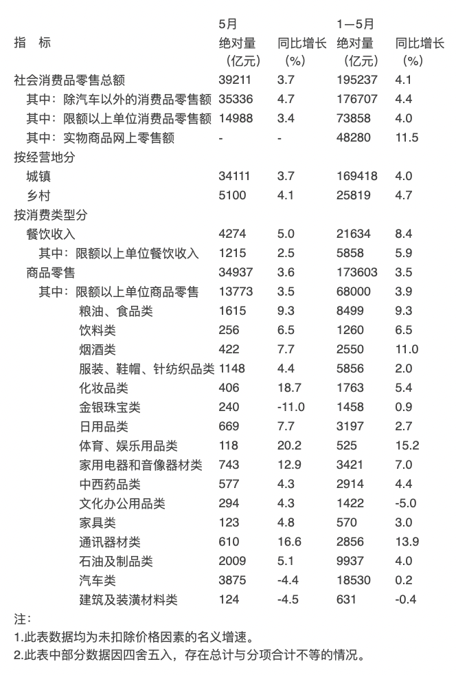 按经营单位所在地分,5月份,城镇消费品零售额34111亿元,同比增长3.7%;乡村消费品零售额5100亿元,增长4.1%。1-5月份,城镇消费品零售额169418亿元,增长4.0%;乡村消费品零售额25819亿元,增长4.7%。