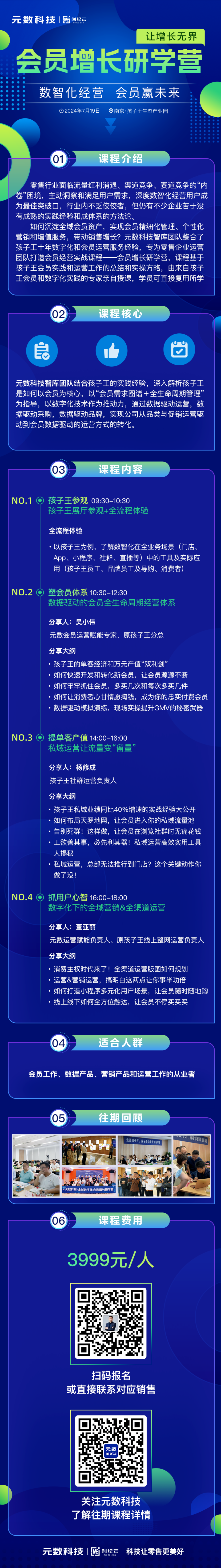 7月19日,“会员增长研学营”将在南京市·孩子王产业园开班,课程时间为1天。想了解更多内容或报名入班,请关注元数Meta公众号,或扫描下图海报二维码咨询报名。