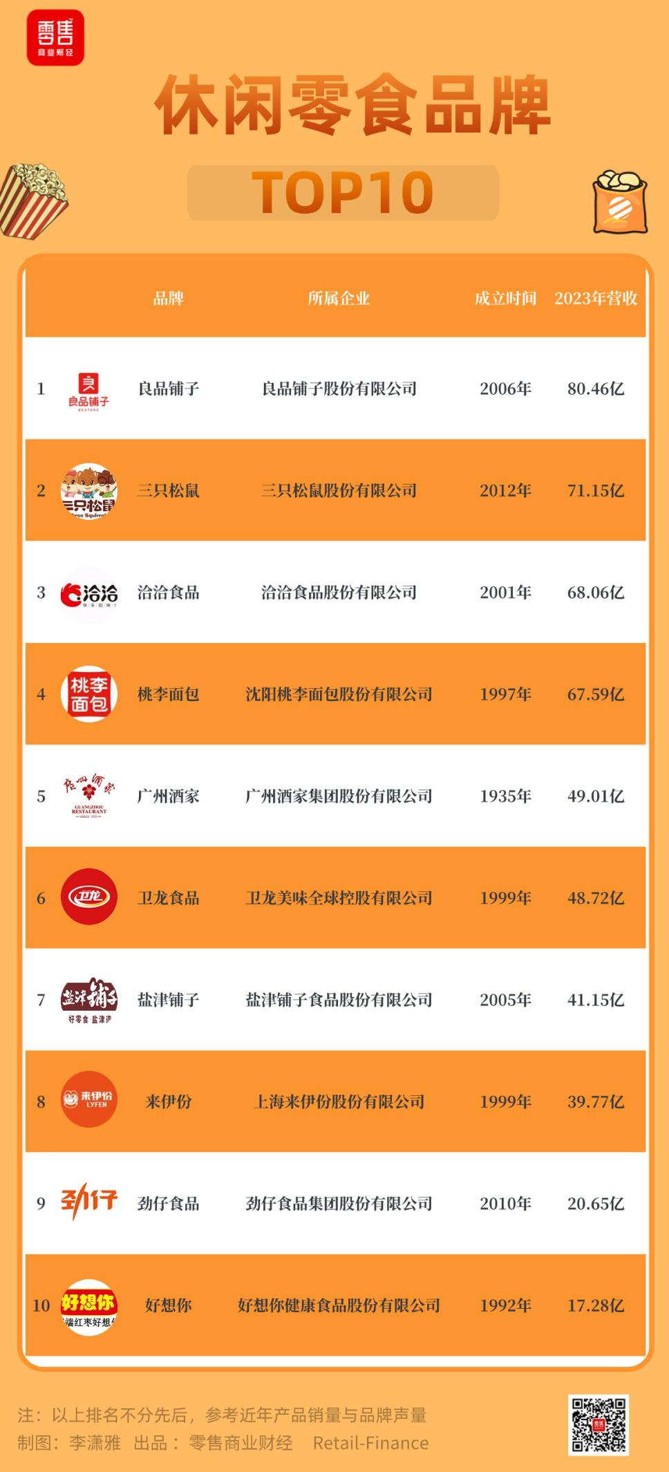 龙商网消息:近日,由媒体评选出的“2023年度中国市场休闲零食品牌TOP10榜单”出炉,该榜单显示,良品铺子以80.46亿元的营收位列榜首。