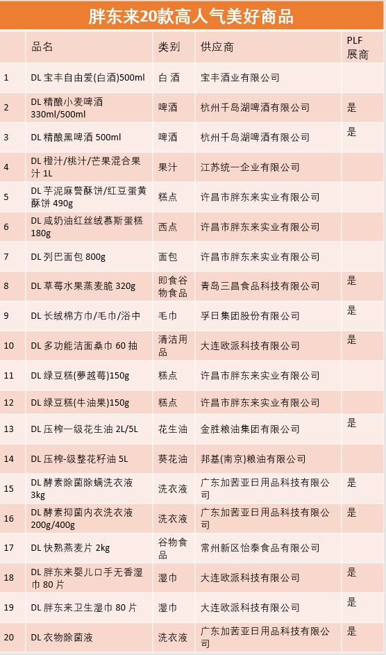 近期,联商网统计的胖东来20款高人气美好产品中,PLF优质展商贡献了11款商品,除5款胖东来自产商品外,贡献率高达73.3%。杭州千岛湖啤酒有限公司、青岛三昌食品科技有限公司、孚日集团股份有限公司、大连欧派科技有限公司、广东加茜亚日用品科技有限公司等PLF展商分别为胖东来定制DL 精酿小麦啤酒、DL草莓水果蒸麦脆、DL长绒棉方巾、DL多功能洁面桑巾、DL 酵素除菌除螨洗衣液等畅销产品。