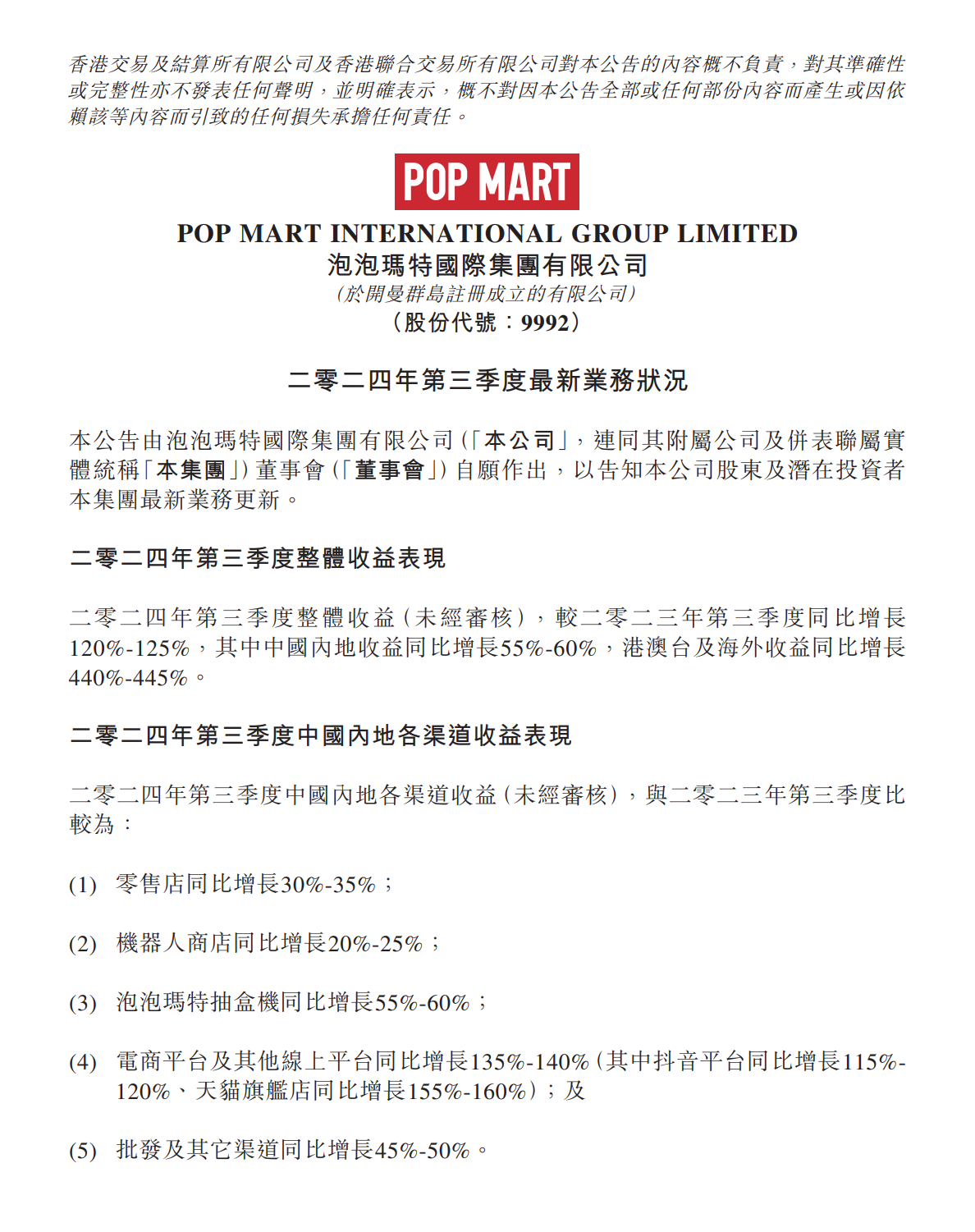 龙商网消息: 10月22日,泡泡玛特在港交所发布公告称,第三季度整体收益(未经审核),较2023年第三季度同比增长120%-125%,其中中国内地收益同比增长55%-60%,港澳台及海外收益同比增长440%-445%。...