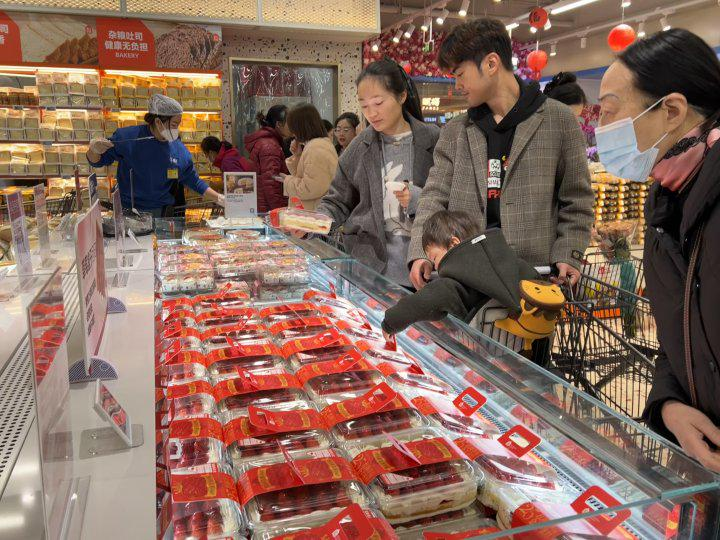 年关将近,门店的鲜花专区特地打造了年宵花氛围,银柳、冬青、洋桔梗、小雏菊、蝴蝶兰盆栽等时令鲜花摆放整齐,姹紫嫣红,十分喜庆。开业不到半天,架上的蝴蝶兰被搬走好几盆,工作人员连忙补货。