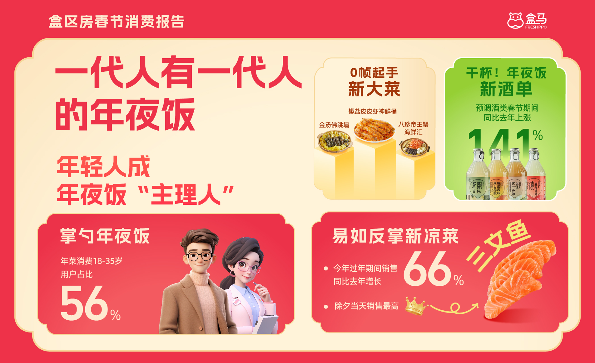 龙商网消息:2月5日,盒马发布《2025盒区房春节消费报告》(以下简称“报告”)。报告显示,18-35岁年轻人已经成为盒马年货消费的主力人群:全权接手办年货,准备年夜饭,营造过年氛围等事项。在他们的主导下,春节消费也开始显现新趋势:“赛博”年菜增长翻倍;“小甜水”爆发式增长;三文鱼成最受欢迎的“凉菜”……此外,更新奇、情绪价值以及性价比拉满的“情价比”好货成为最受年轻人青睐的春节伴手礼。