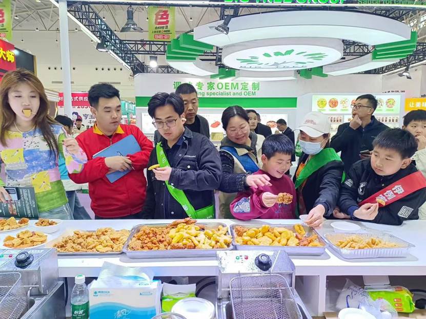 展位现场,经典黑椒鸡块、藤椒琵琶腿、薄脆蒜蓉鸡翅根、至尊奥尔良烤对翅、肉好多烤肠、辣味小串、火锅肉片、五香鸭腿、红糖糍粑等新品、爆品一字排开,香气四溢的试吃区前围满了尝鲜的观众。新和盛工作人员热情娴熟地演示“3-5分钟出餐”的便捷操作,一盘盘制作好的美食摆上试吃台,很快就被一抢而空。