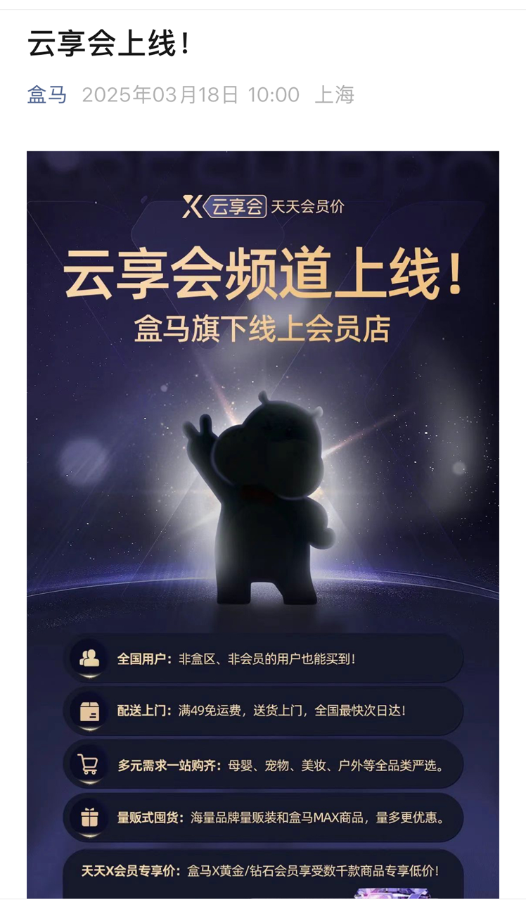 龙商网消息:近日,盒马旗下的“盒马云超”正式升级为“云享会”。