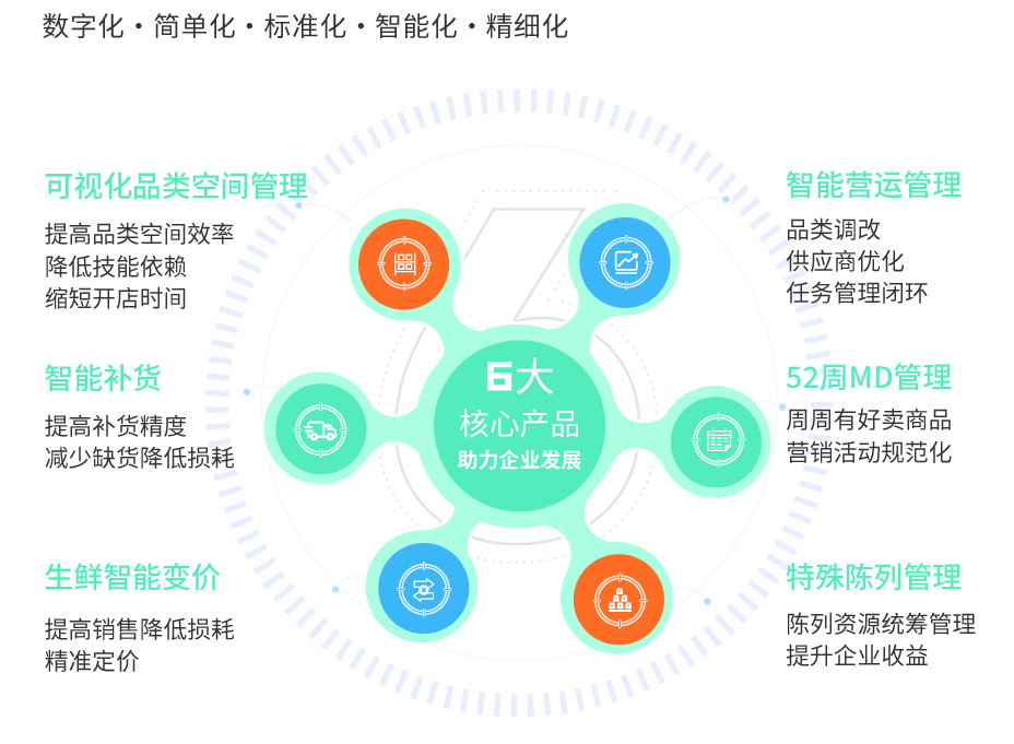 本次展会数图带来了六款智慧零售系统产品,分别是可视化品类空间管理系统、智能营运管理系统、智能补货系统、52周MD管理系统、特殊陈列管理系统和生鲜智能变价系统。
