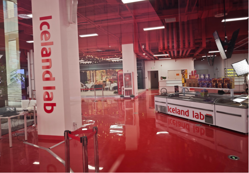该家店被命名为“埃丝蓝实验室”(Iceland Lab)。叫作实验室,因为在这家店的实际运营中,有很多不同于英国本土的运营理念和运作方式。探访时超市并未开放,龙商网&超市周刊现场看到,基地内搭建了许多灯光、直播设备,在总面积6800平方米的场地内,除了陈列来自Iceland以及本土品牌的商品外,还有着20余个实景直播间。目前主要销售方式是线上直播,线下配送。