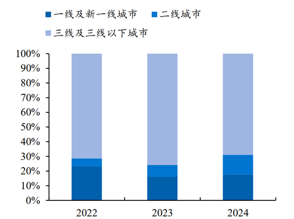 另一个重大变化是低能级区域的增长性。疫情以来,三四线消费韧性强于一二线,县乡好于城市,乡村又好于城镇,比如在2024年乡村社零增速为4.3%,城镇社零增速为3.4%。如果再考虑人口权重,根据华创证券的测算,非一二线城市的消费体量,占到整个经济体的60%左右。