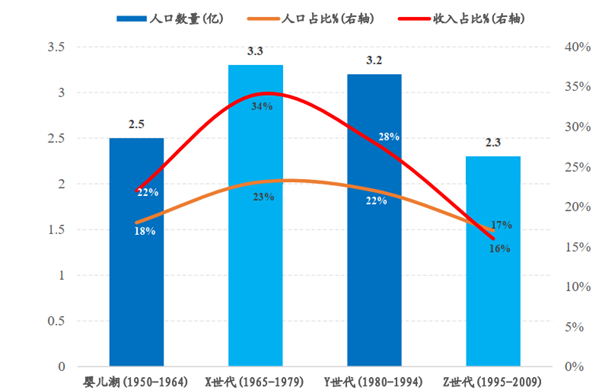 从人群结构上来看,Z世代(1995-2009)的人口和收入占比,分别达到17%和16%,日益成为消费当中的中坚力量,因此他们的消费倾向就成了最具成长性的细分方向。