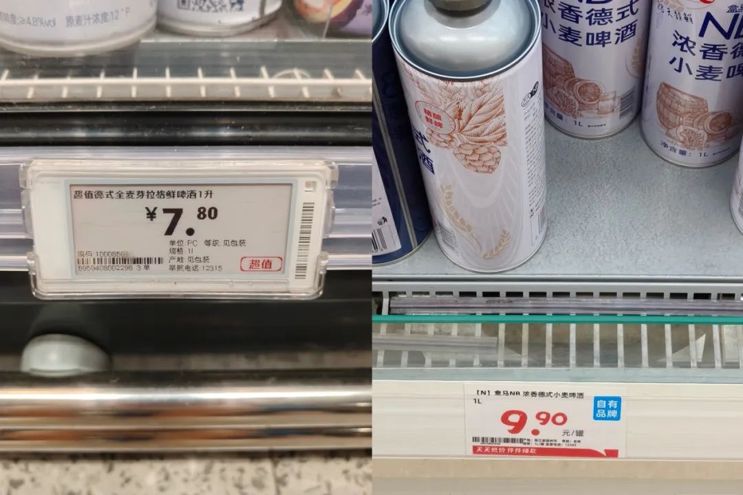在定价上,盒马NB的浓香德式小麦啤酒1L售价9.9元,比奥乐齐超值系列同规格的德式全麦芽拉格鲜啤酒(单价7.8元)稍贵一些。