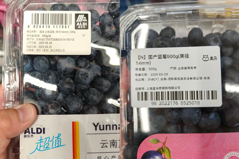 另外,奥乐齐超值的云南蓝莓果径14mm 500g售价29.9元,产地云南红河,供应商为佳沃果业,盒马NB的国产蓝莓果径14mm 500g售价25.9元,产地为山东青岛,供应商为成都果挑友农业有限公司。