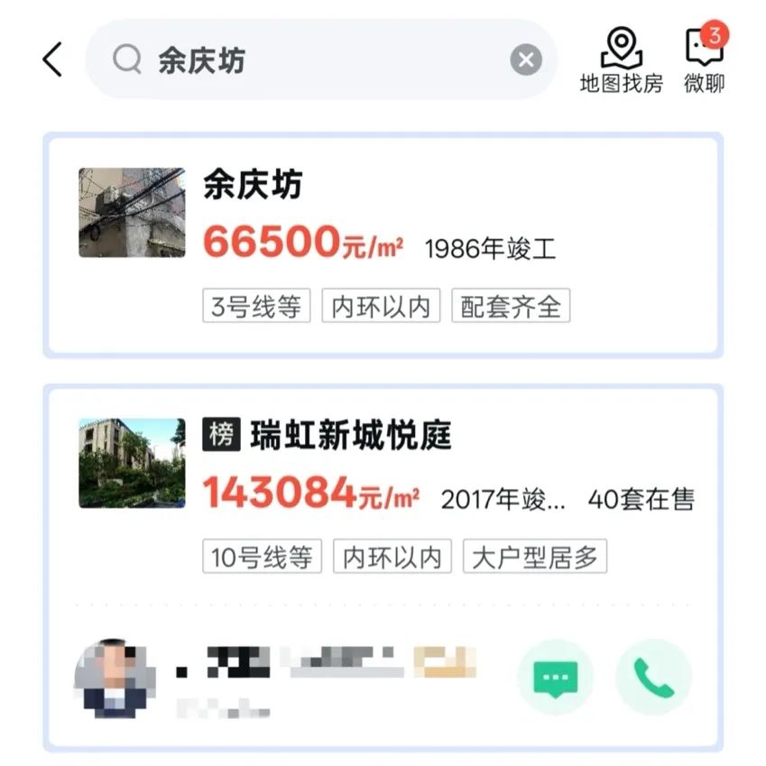 以盒马NB四川北路店旁边的余庆坊小区为例,第三方平台数据显示其房屋均价为6.65万元/平米;而在奥乐齐瑞虹天地月亮湾店马路对面的瑞虹新城悦庭,第三方平台数据显示其均价约为14.3万元/平米。