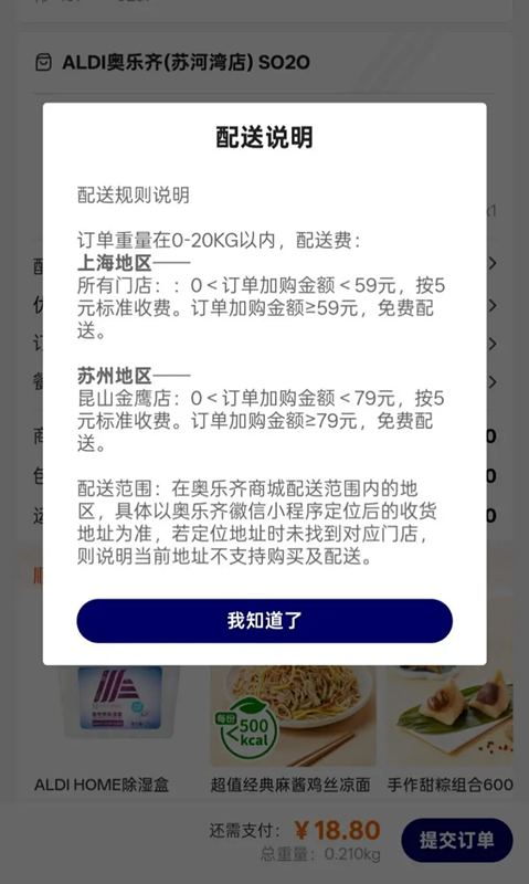 奥乐齐门店目前接入了饿了么、京东到家、美团外卖等第三方平台,其自营小程序商城也提供配送到家服务,运力服务商为京东达达,在上海地区要求订单不满59元收取5元配送费、在苏州地区不满79元收取5元配送费,打包费每单0.9元。