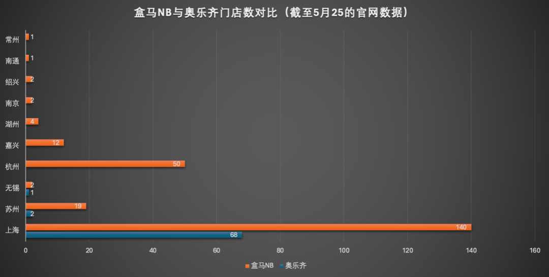 目前,仅从门店数量和覆盖规模来看,原生于本土市场、背靠盒马鲜生品牌影响力的盒马NB,比奥乐齐中国进入了更多的城市、也开出来更多的门店。