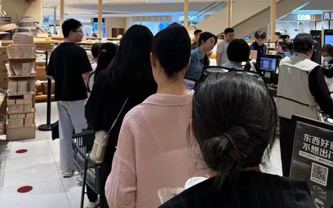 上图是上海瑞虹天地太阳宫店晚上九点自助结账机前排队结账的场面,可以看到,店内客流很大。这家地处虹口的店位于商场的负一楼,但客流丝毫不输繁华社区街边的门店。