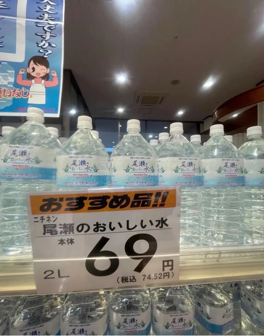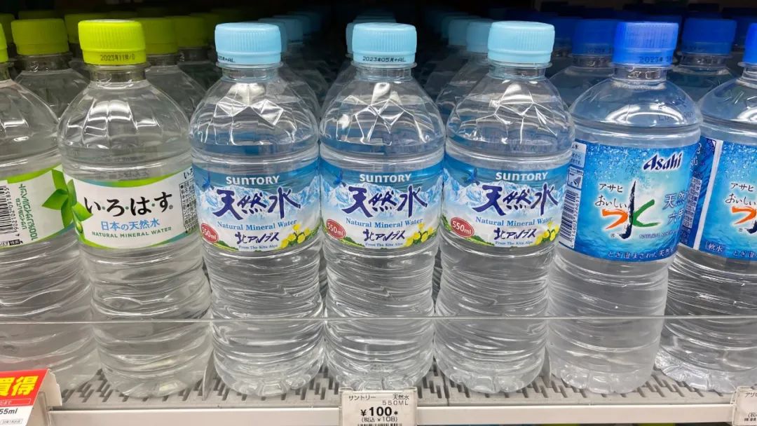 同样是三得利天然水,2L瓶装水售价100日元,550mL瓶装水却要108日元。对,没有写错,店员也没标错价格。