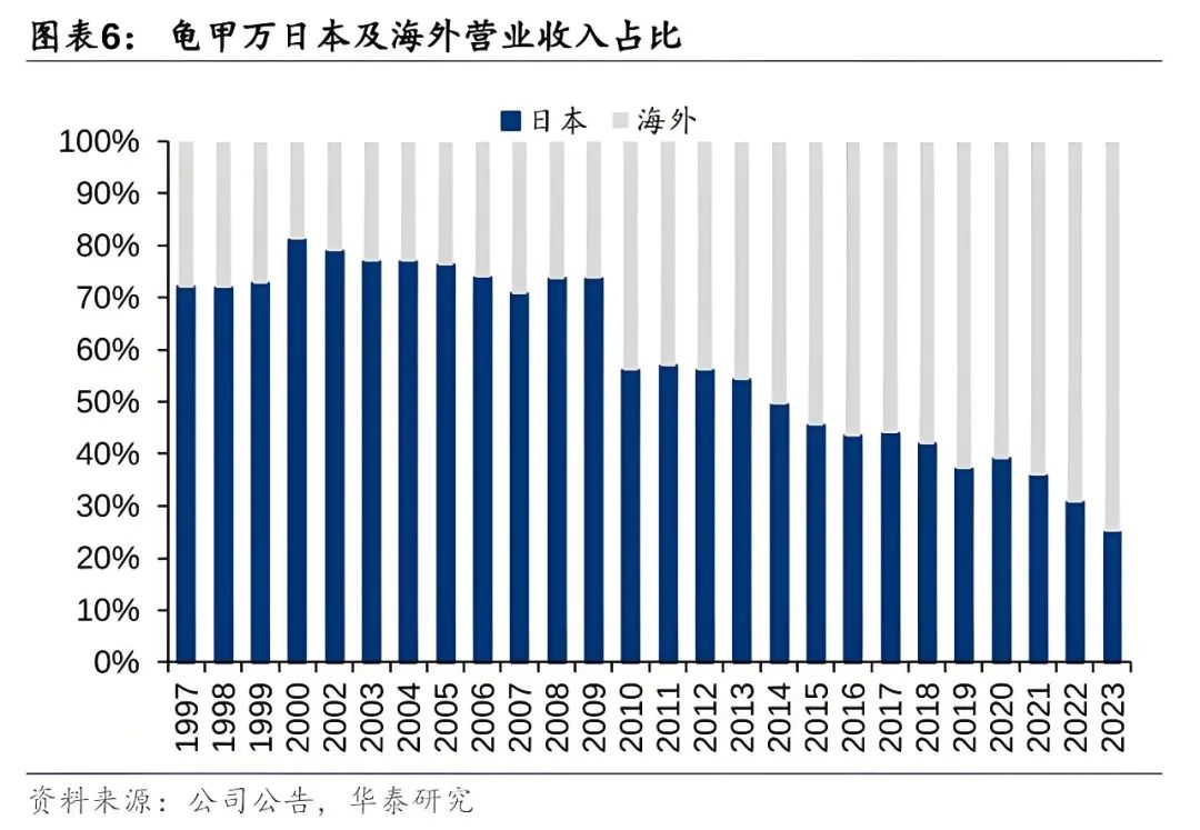 海天味业其实早就进入了海外市场,但成绩一直都不理想,官方始终没在财报中披露海外市场的具体业绩。在回答投资者的相关提问时,官方只是表示现阶段海外市场在营收中的占比较低。第三方的估算数据显示,2024年,海外市场在营收中的占比约为7%。作为对比,来自日本的同行“龟甲万”的海外市场营收占比已经达到了76%。