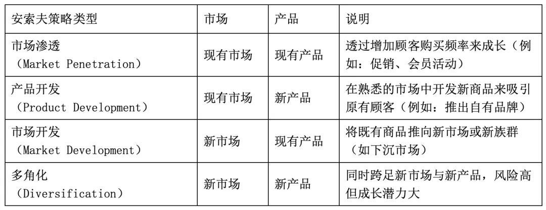 ·安索夫矩阵:从成长策略切入,重点分析品牌现在主力商品,是在既有市场中卖熟品(市场渗透),还是导入新产品给熟客(产品开发)?比如,针对咖啡等下滑品类,可通过“新产品开发”或“新场景营销”刺激消费,而非直接撤架。