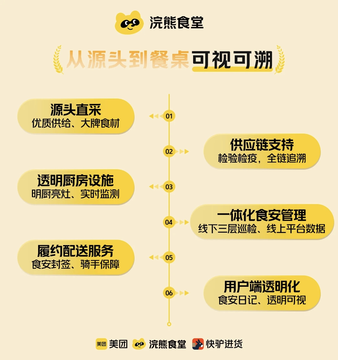 与此同时,在将近半年的试点工作中,美团浣熊食堂已经探索出了一套从产地到餐桌可视可溯的经营方法,在一定程度上可以实现全链路可追溯可透明的放心外卖模式。