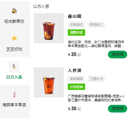 聚焦到见康星茶饮,官方小程序显示,目前其有7大系列产品,包括轻养生茶饮、轻体鲜果饮、芝芝好戏、以方入茶、咖星必备、清爽草本果茶、元气醇乳茶,SKU超30个。