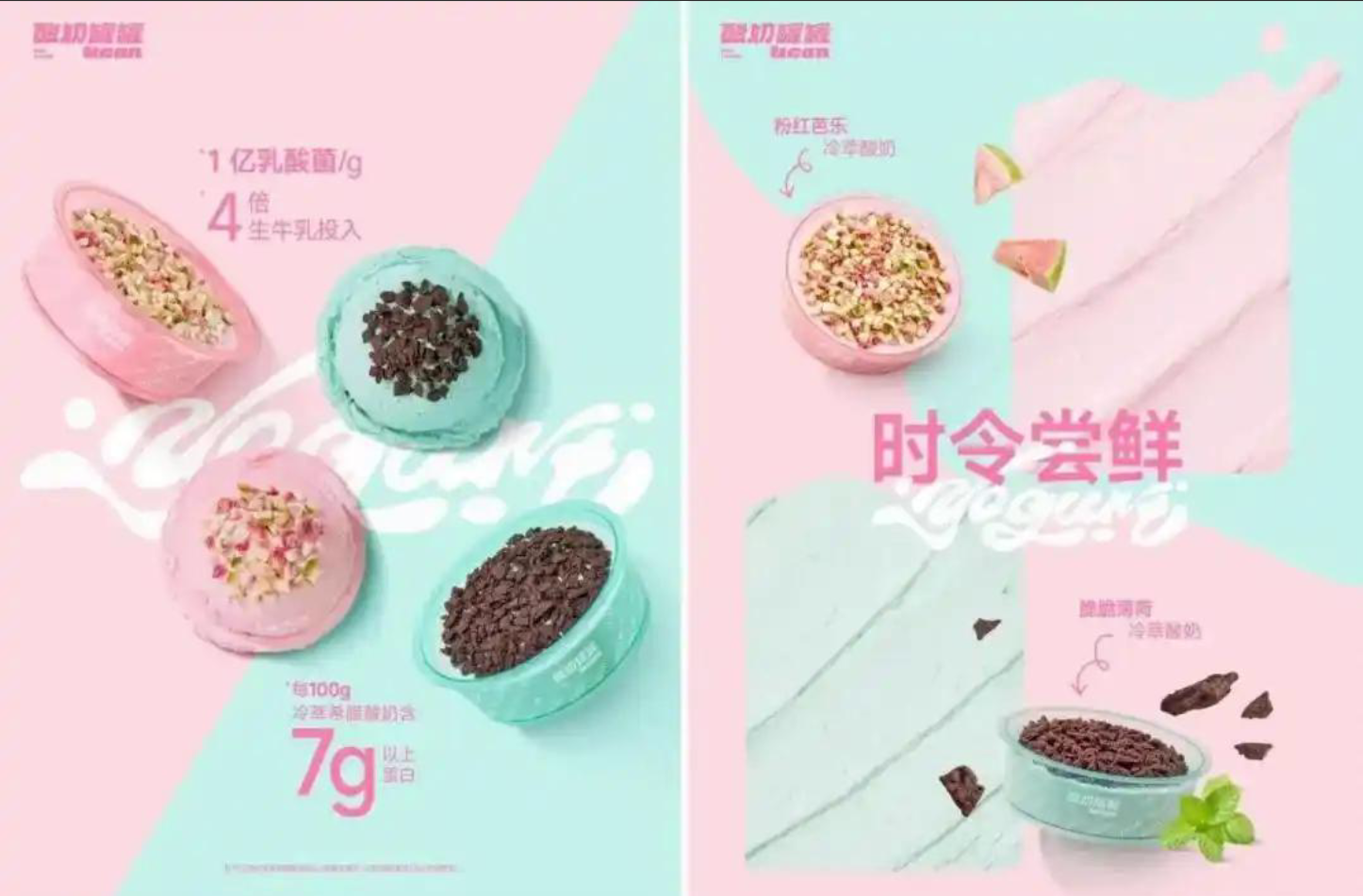 “喝酸奶”系列成功后,酸奶罐罐以酸奶为圆心继续拓品类,增加“吃酸奶”系列,从当下最火的“干噎酸奶”切入,做出了粉红芭乐冷萃酸奶、脆脆薄荷冷萃酸奶两个爆款,还研发了酸奶大福等甜品。