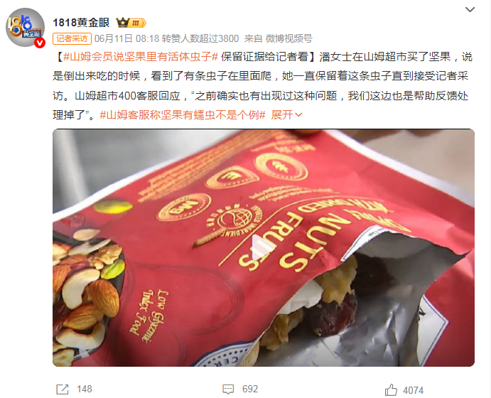 但是近年来,山姆会员店的食品安全问题犹如打开了“潘多拉魔盒”。网络上各类吐槽层出不穷,从发酸的牛奶到瑞士卷里的陈米,再到坚果里有活体虫子、卤菜标签的“阴阳日期”等问题,频频被曝光,曾经的品质神话逐渐崩塌。