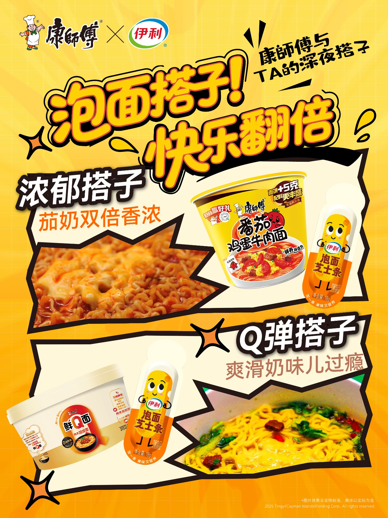 此次跨界合作旨在颠覆传统速食印象。伊利的泡面芝条,是伊利洞察消费者需求多元化,场景多样化的创新型产品,精选新西兰进口芝士,10倍牛奶钙与4倍牛奶蛋白,以创新杀菌工艺,实现即撕即享常温保存,瞬间为美味的康师傅面汤注入浓郁奶香与丝滑口感。;康师傅构建的“中国味觉地图”川渝泡椒牛肉面、华北西红柿打卤面、西北油泼辣子酸汤面、华南红葱头葱香排骨面……,更是为这一搭配带来更丰富的体验;这对黄金组合不仅解决了深夜时分对便捷美味的渴望,更巧妙融入了营养补充,轻松获得一份兼顾美味与安心的能量补给,让“康师傅深夜面馆”更添健康滋味。