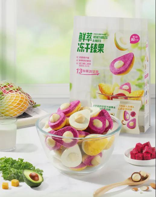 新品共有两种双拼组合,分别为冻干羽衣甘蓝牛油果&冻干椰浆芒果双拼和冻干巴西莓火龙果&冻干芒果香蕉双拼,一袋搭配13种果蔬和坚果原料,一袋中两种口味均有。