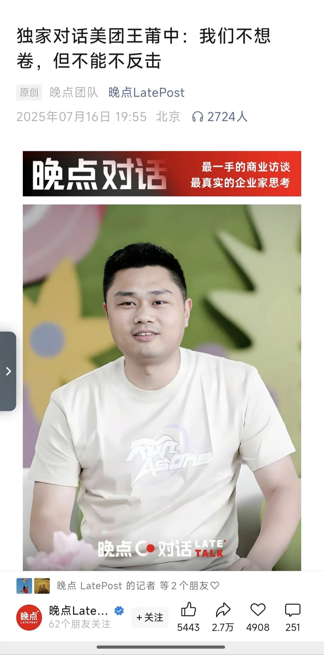 在AI领域,美团选择“聚焦而非铺开”。王莆中坦言,资源有限,只能在配送路径优化、用户需求预测等与主业相关的方向投入,“别人来你地盘非理性冲击,你得先保住主业,才有机会搞AI”。2025年上半年,美团内部推动了多项实验性AI产品,但因大战被迫将精力转向防御,“这是战争的代价之一”。