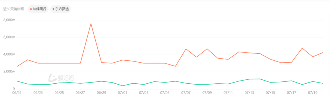 在粉丝数量上,截至7月中旬,与辉同行已经突破3000万大关,东方甄选落后一截,粉丝数仍在2800W左右徘徊。蝉妈妈数据显示,在直播观看方面,在近30天(6月21日至7月20日)中,与辉同行直播日均观看1573.7W,东方甄选仅384.3W;而在销售额趋势对比中,尽管与辉同行出现大幅下降,但仍在东方甄选之上。