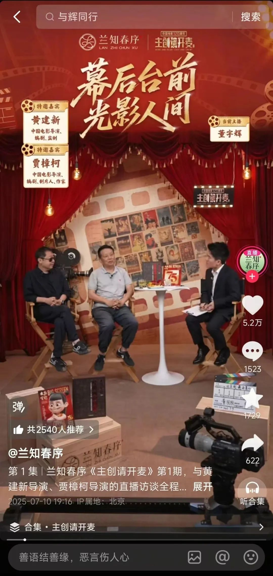 7月3日,他开通新账号“兰知春序”,聚焦文化和旅游领域,一周吸粉150万;9日,该账号推出全新栏目《主创请开麦》,由董宇辉对话黄建新、贾樟柯导演,聚焦中国电影的幕后台前。