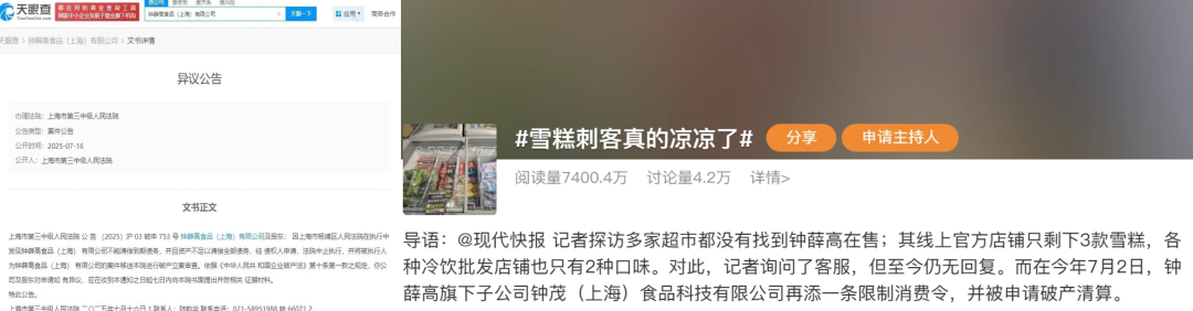 因为还不上债务,钟薛高最近被移送进行破产立案审查,微博上很快出了一条#雪糕刺客真的凉凉了#的热搜。