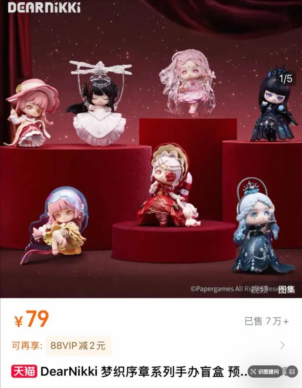 而在今年 5 月底,游戏公司叠纸为其旗下女性向游戏 “暖暖” 系列开创了全新潮玩品牌 DearNikki,同时首发了暖暖 “梦织序章” 系列盲盒,一经上架便数次补货。据天猫数据显示,今年 618,叠纸心意旗舰店超越泡泡玛特旗舰店,登顶天猫 618 潮玩抢先交易榜。
