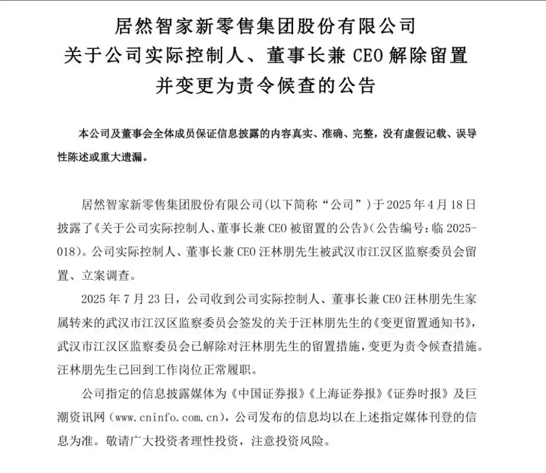 今年 4 月 18 日,居然智家公告,公司实际控制人、董事长兼 CEO 汪林朋被武汉市江汉区监察委实施留置。历经整整三个月的留置调查后,7 月 23 日,汪林朋的强制措施发生变更,从留置转为 “责令候查”,并且已恢复工作。值得注意的是,此次变更措施的时间点,正是《中华人民共和国监察法》规定的三个月留置期限的最后时限。而 “责令候查” 这一制度设计,适用于涉嫌严重职务违法或犯罪的被调查人。这意味着,虽然汪林朋能够重返工作岗位,却需遵守未经监察机关批准不得离开所居住区域、接到通知须及时到案接受调查等规定。