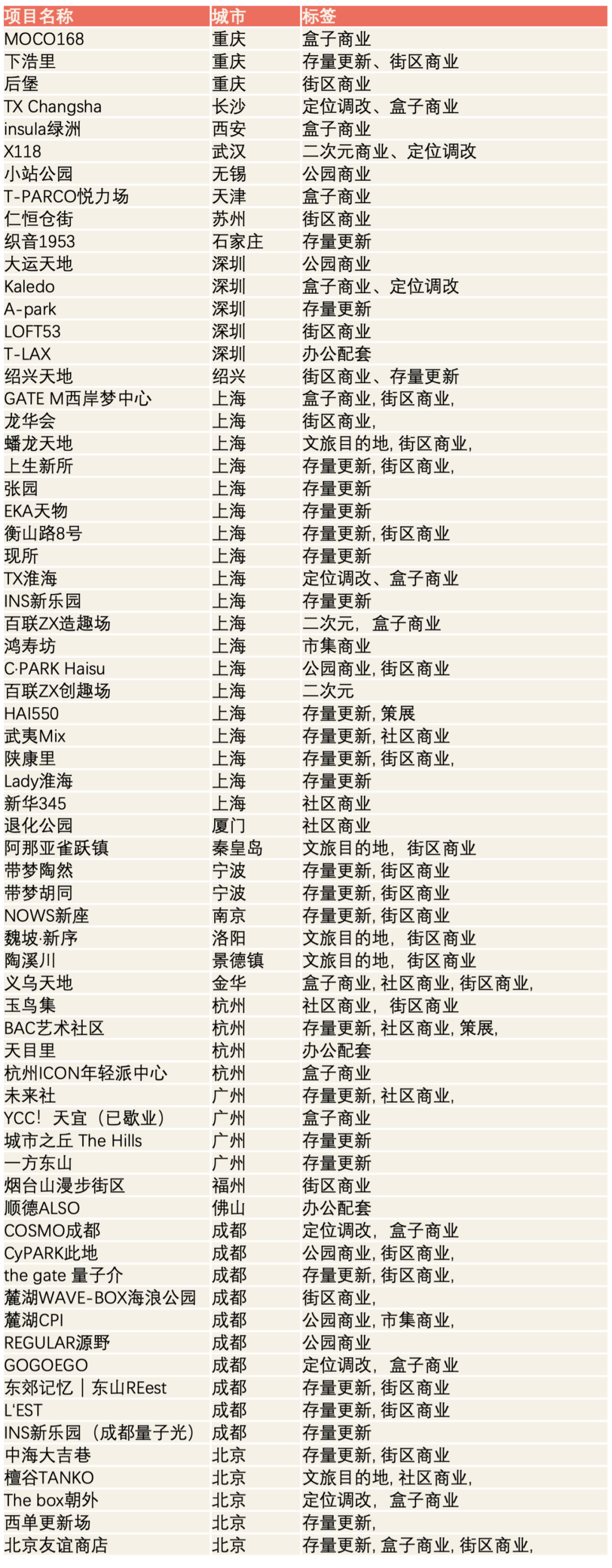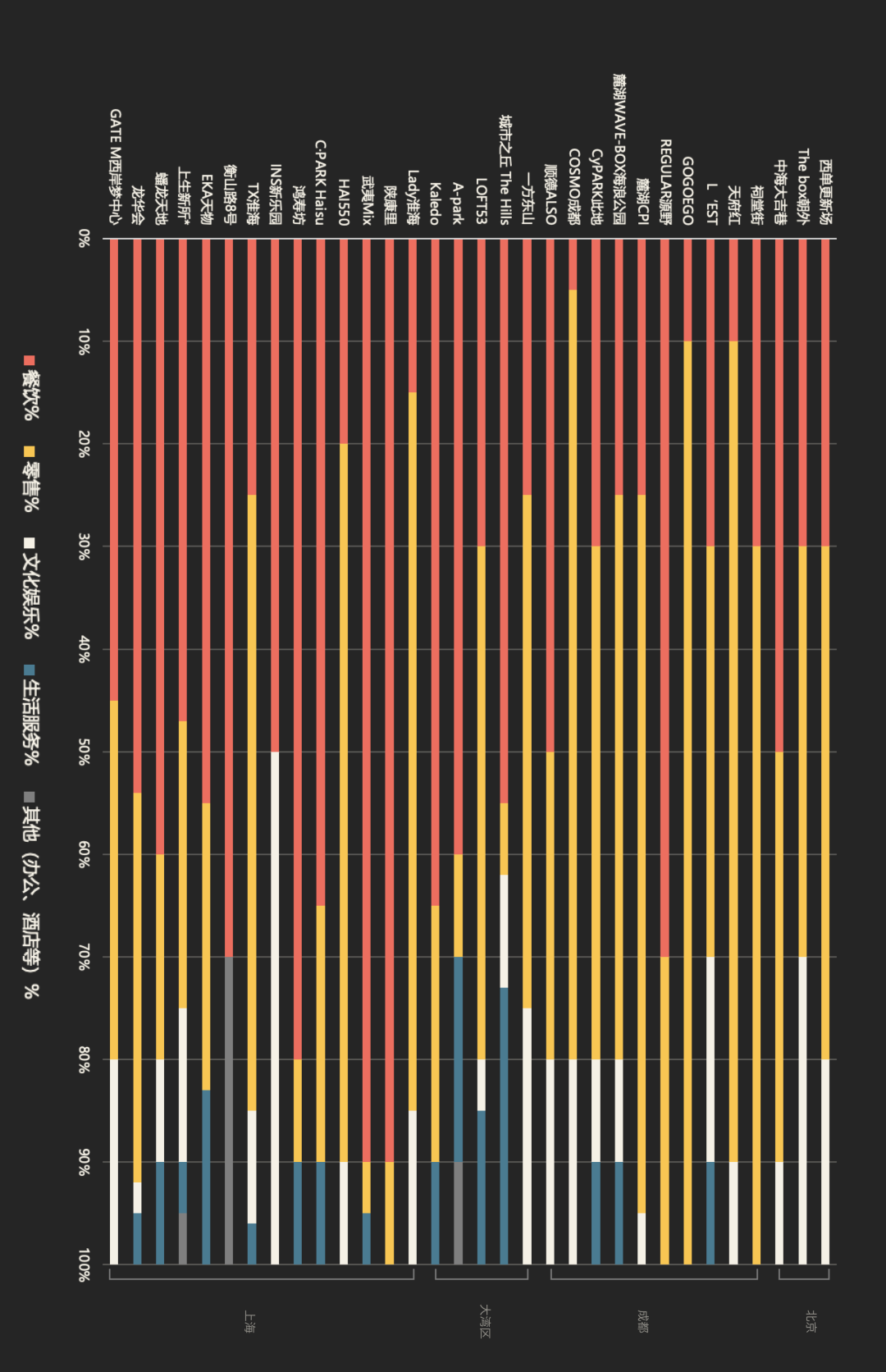 通过将上述四个城市/区域的非标项目,汇总在一张图表上进行观察,可以更明显看出,不同城市的项目确实在主导企业背景、改造运营逻辑、业态品牌组合上,有着明显的差异。