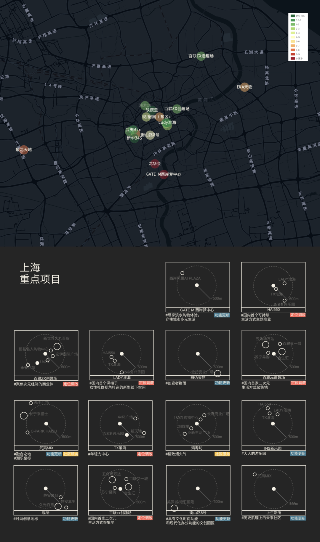 其中上海项目数量断层领先(18个),其次是成都的10个,北京、深圳、杭州、广州近期非标商业也渐成气候。