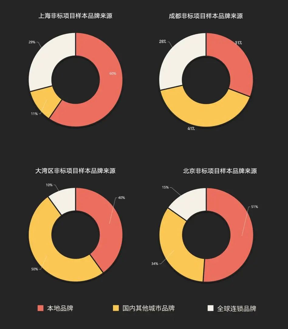 以及在品牌来源上,上海非标商业项目以本地品牌为主,国际连锁品牌主要集中在餐饮。而成都除了服饰领域大量的本地品牌之外,也有相当比例的国内其他城市品牌入驻。