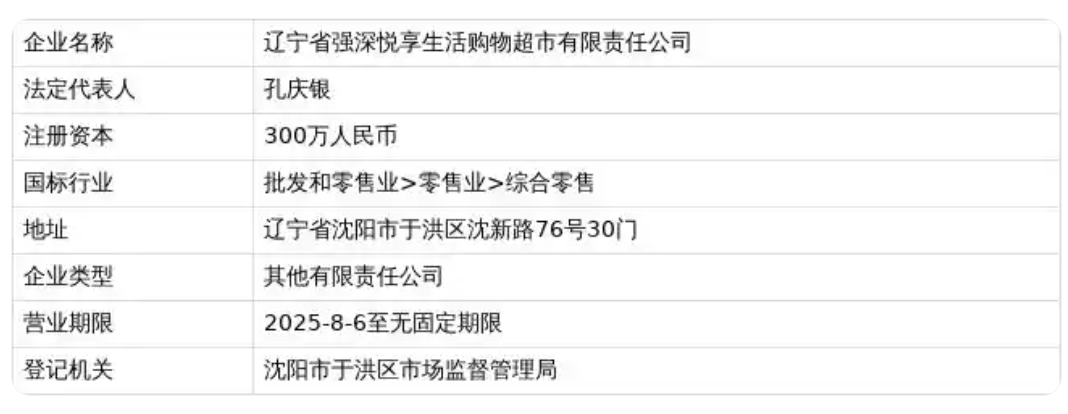 天眼查显示,近日,辽宁省强深悦享生活购物超市有限责任公司成立,法定代表人为孔庆银,注册资本300万人民币,辽宁省强深企业管理咨询有限公司、辽宁省涛涛至远生态果蔬有限责任公司持股。