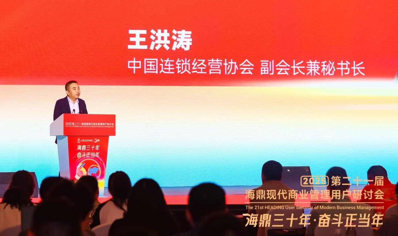 中国连锁经营协会副会长兼秘书长王洪涛代表协会致辞,他指出,过去三十年,海鼎扎根于零售行业,引领行业的数智化变革,一路走来硕果累累。当下,零售业正站在全新的发展起点上,变革的步伐不断加快,机遇与挑战并存。他期待,海鼎进一步深耕核心技术,在人工智能、大数据应用上持续突破,成为零售数智化转型的核心驱动力;大力拓展国际化视野,将中国验证成功的先进理念与技术推向全球,提升中国零售科技国际影响力;持续秉持开放协同理念,与产业链各方紧密合作,共建繁荣生态,携手推动零售业高质量发展,为全球零售创新贡献更多中国智慧与力量。