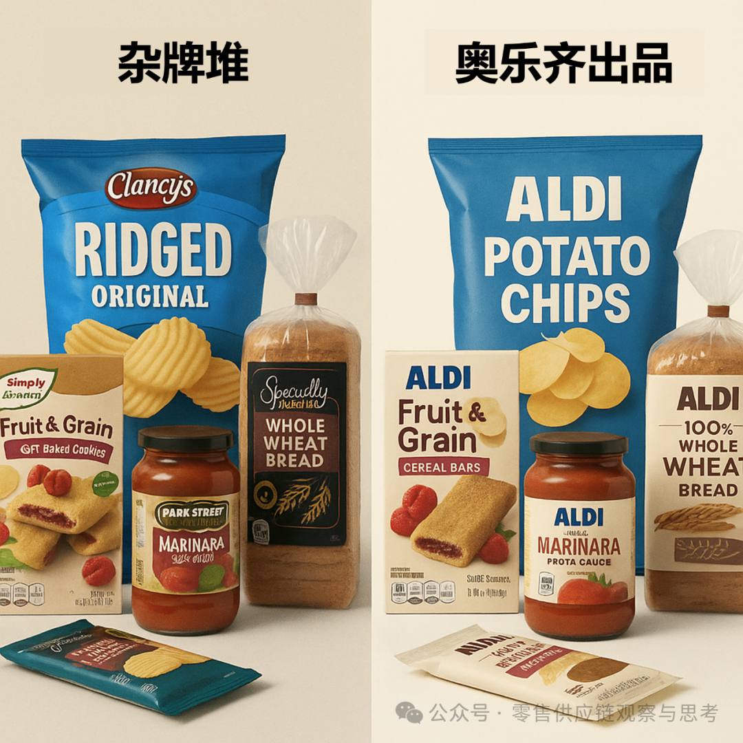 奥乐齐如今正处在这个转折点。它不打算完全舍弃子品牌,而是采取“统一母品牌+少数子品牌”的混合路径。对于奥乐齐来说,问题从来不是SKU数量的多少,而是顾客根本记不住那些名字。升级的核心,就是要让“奥乐齐出品”成为真正被认知和信赖的标识。