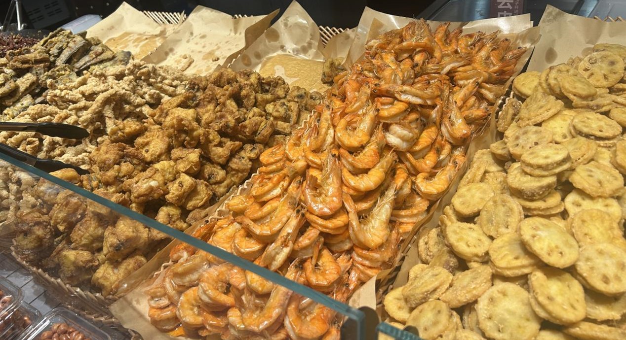 开业一小时后,店内客流迅速攀升,生鲜、熟食及烘焙区尤为火爆。熟食区明档现场制作炸物、烤肠、关东煮等,即买即食,烟火气十足,多个档口前排起长队。部分商品立即出现热销盛况:4元每根的烤肠深受年轻人喜爱,需持续补货,水产区因人流量大一度通行困难,其中河虾、贝类最受欢迎。