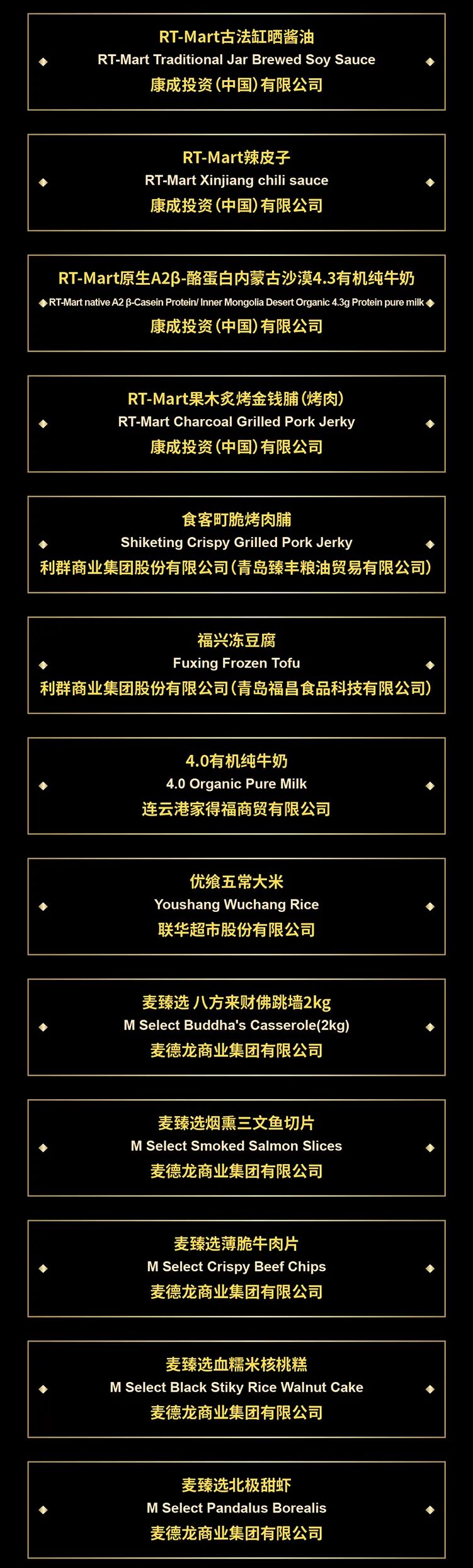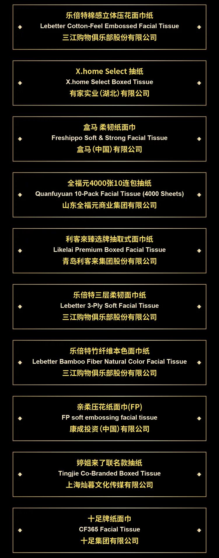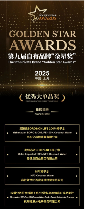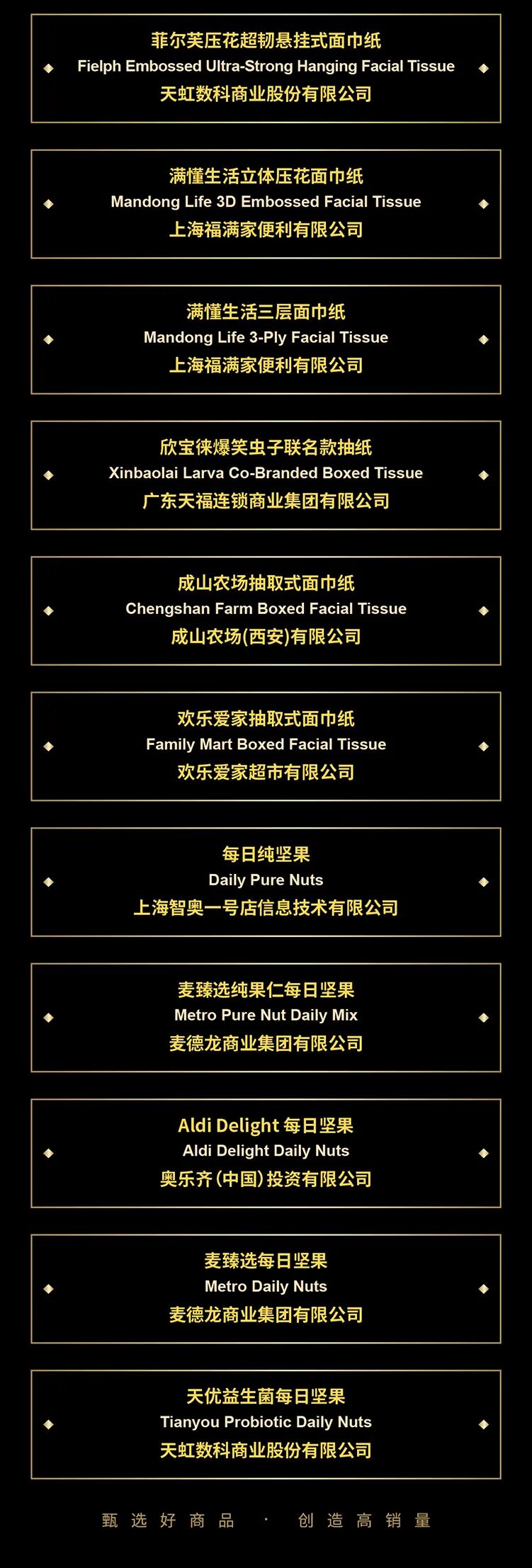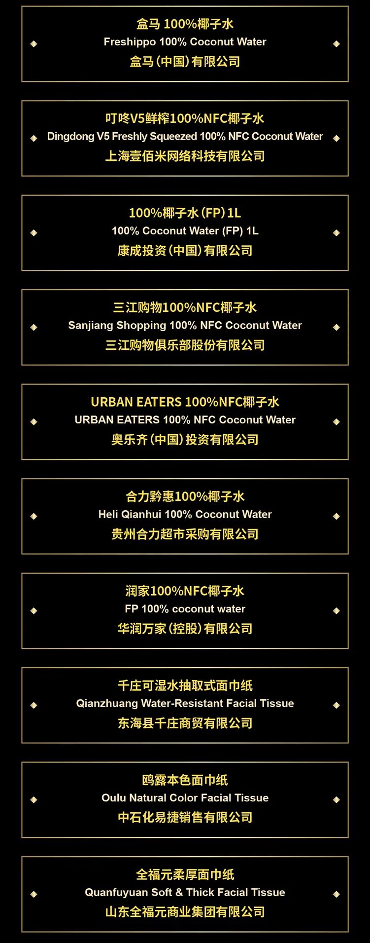 经过消费者深度调研、专业评审团评审,中石化开发的易臻选BORO&ONLIFE 100%椰子水获红标荣誉;千庄商贸、中石化易捷、山东全福元、三江购物、有家实业、盒马(中国)提报的抽纸获得红标荣誉;京东1号店开发的每日纯坚果、麦德龙开发的麦臻选纯果仁每日坚果获得每日坚果红标荣誉。
