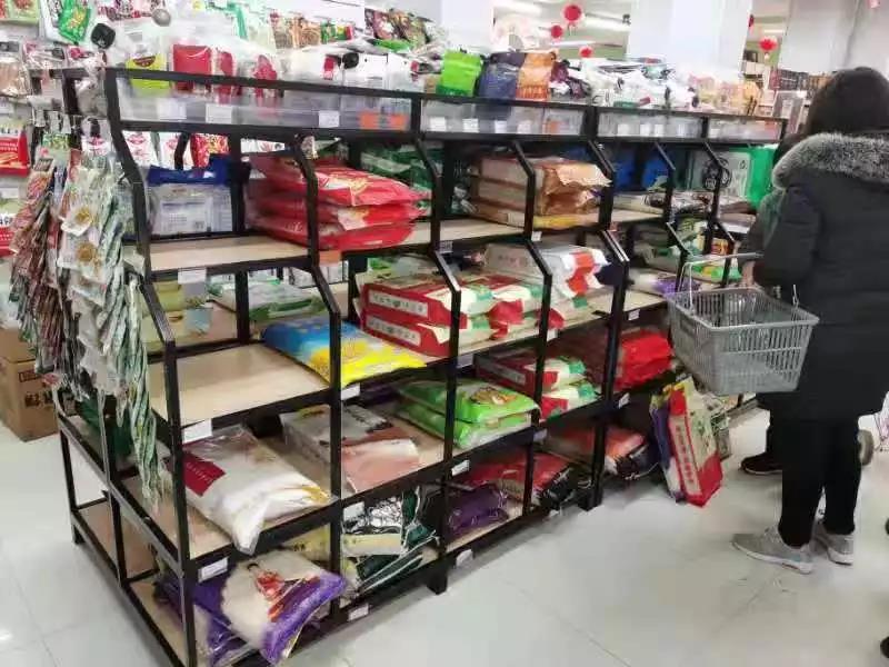 李晓“封城”后在超市采购,货架上的米袋数量已不多。