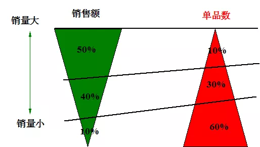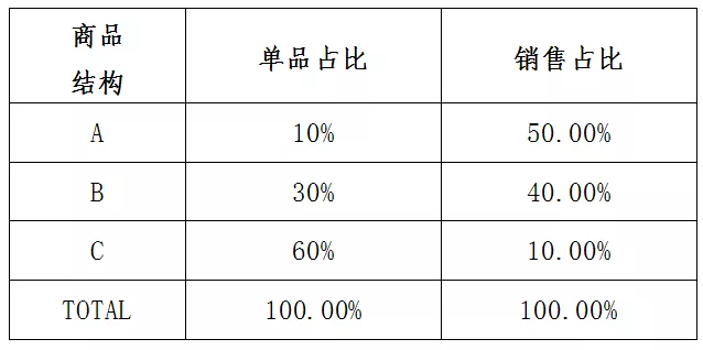 我们看到上面有两个相反的图形,分别代表着销售额占比和单品数比,这两个占比就是商品结构ABC分析的两个关键数据,也就是说多少占比的单品数创造了多少占比的销售额,现在我们把这张图形变成行业标准的参考表格: