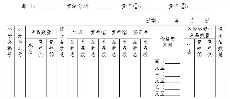 这张表格通过对竞争对手及行业标杆的对比分析,来制定各个小分数的单品数、品牌结构和价格带结构,所以这张表格的基础是竞争对手和行业杆标的全品项市调数据,也就是说把竞争对手和行业标杆的这个小分数的单品数、品牌结构和价格带完整填写进表格。