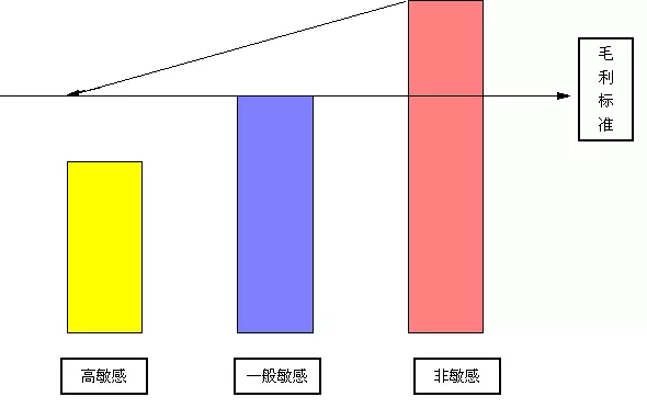 有了这个概念后,我们会看到非常敏感品类通过我们的营销不断扩大销售占比,将此类商品高出毛利标准部分的毛利率转化为毛利额来补充高敏感性品类做价格形象而减少的毛利部分,这样我们才能做到既保证了敏感性商品的价格形象,又确保整体毛利的稳定。