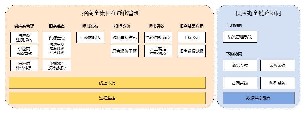 数字化招商系统,通过SaaS部署实现采购、招商业务全流程在线化、网络化和数字化,强化总部监管,推进零供合作公开公正透明,实现“阳光采购”。